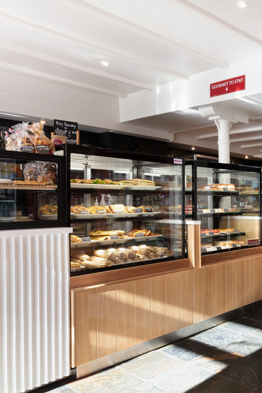Interior of a bakery with display case of baked goods, shelves of jars and bread, and signs indicating 'Gourmet to Stay' and 'Gourmet to Go' View fullsize